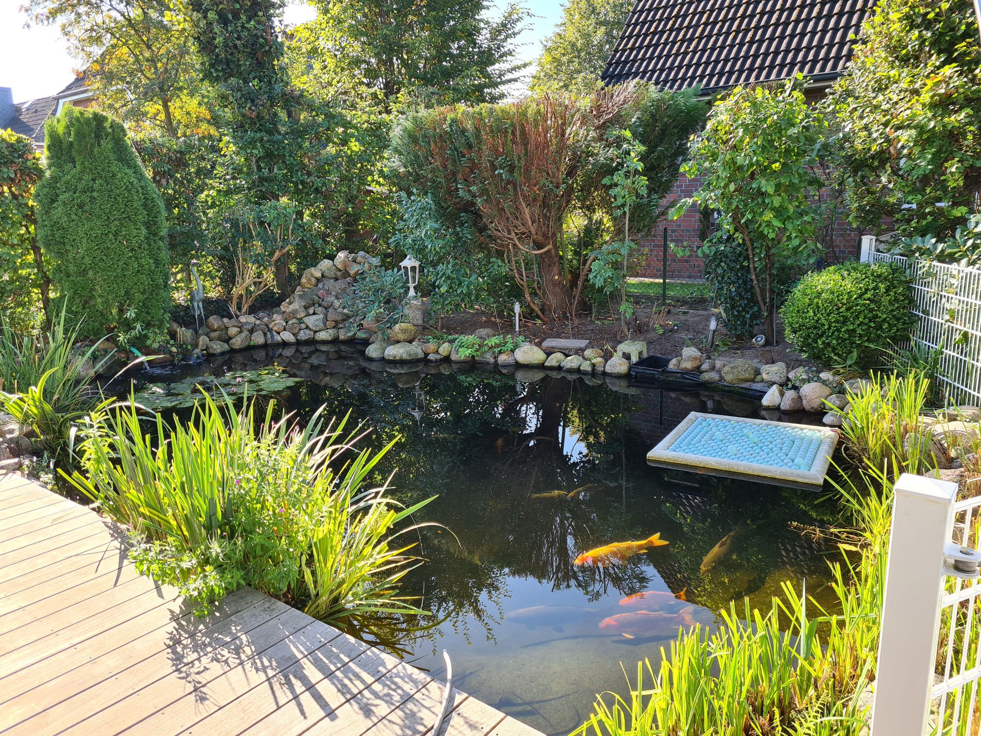 Der Teich wurde komplett entkernt. Neue Folie wurde eingeschweißt, der Bachlauf wurde neu modelliert und mit GFK laminiert, zusätzlich kam im vorderen Teil, wo der Bambus war, auch ein kleiner Bachlauf hin, auch dieser wurde mit GFK laminiert.