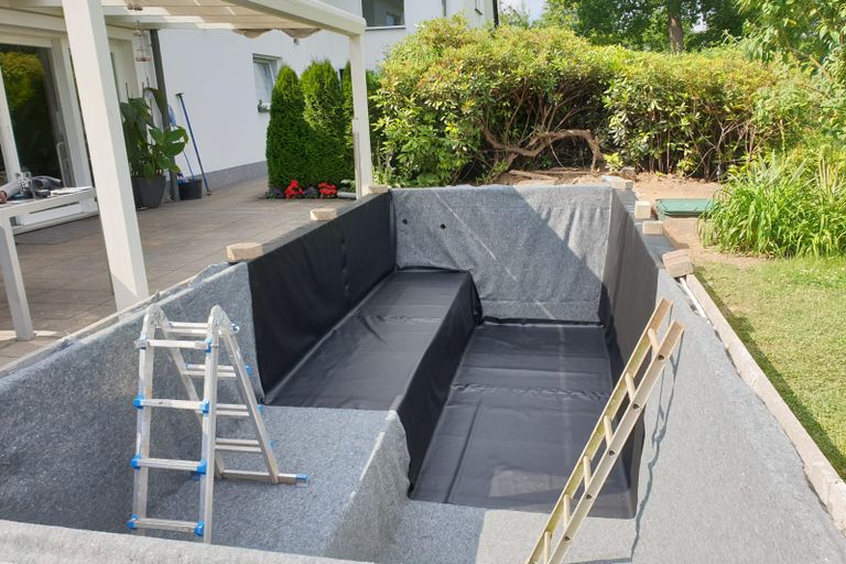 Der Aushub, so wie die Verschalung der Wände, wurden durch den Kunden durchgeführt. Das Legen von Vlies und Folie, so wie das verschweißen und zusätzliche versiegeln der Nähte, wurde von uns ausgeführt. Diverse Restarbeiten und die Dekoration wurden vom Kunden übernommen.